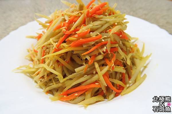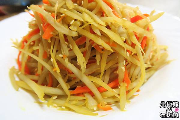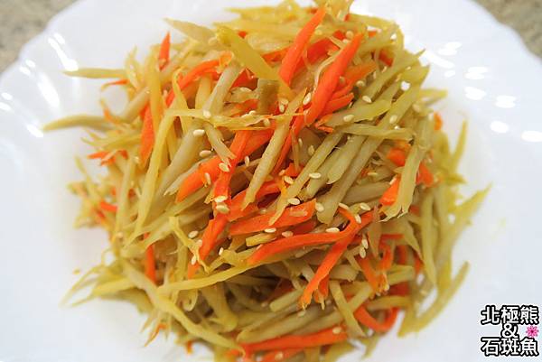 5.起油鍋,胡蘿蔔絲炒至略軟,加入牛蒡絲稍微拌炒,加入一大匙米酒炒香(米酒燒乾不留湯汁),再加入糖和鹽巴調味拌勻,熄火倒入白芝麻拌勻即可。