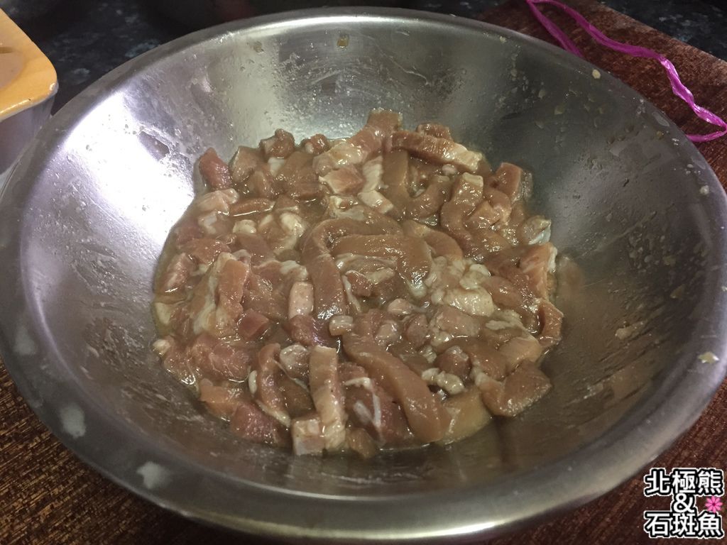 1.醃肉,一匙醬油、一匙米酒、一匙太白粉、糖少許,抓勻後靜置10~15分鐘