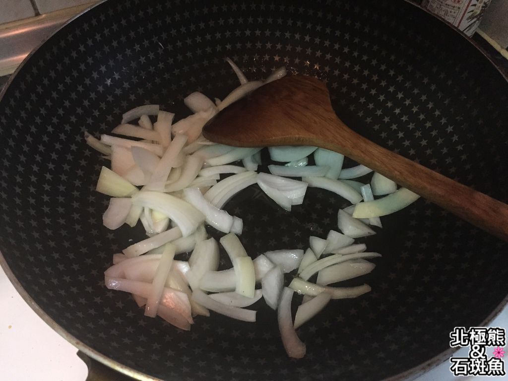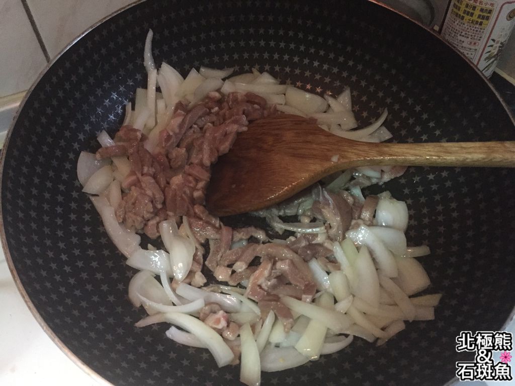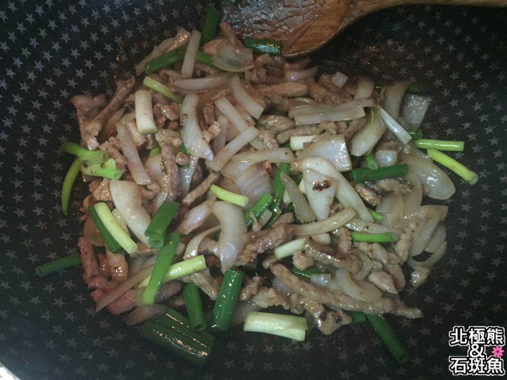 4.豬肉熟後,加入青蔥,一匙米酒熗鍋後關火起鍋即可
