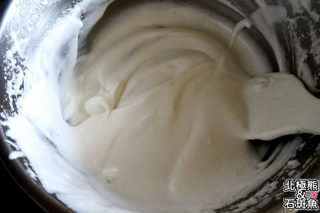 將蛋白雙分兩次混入剛剛調製好的麵糊內