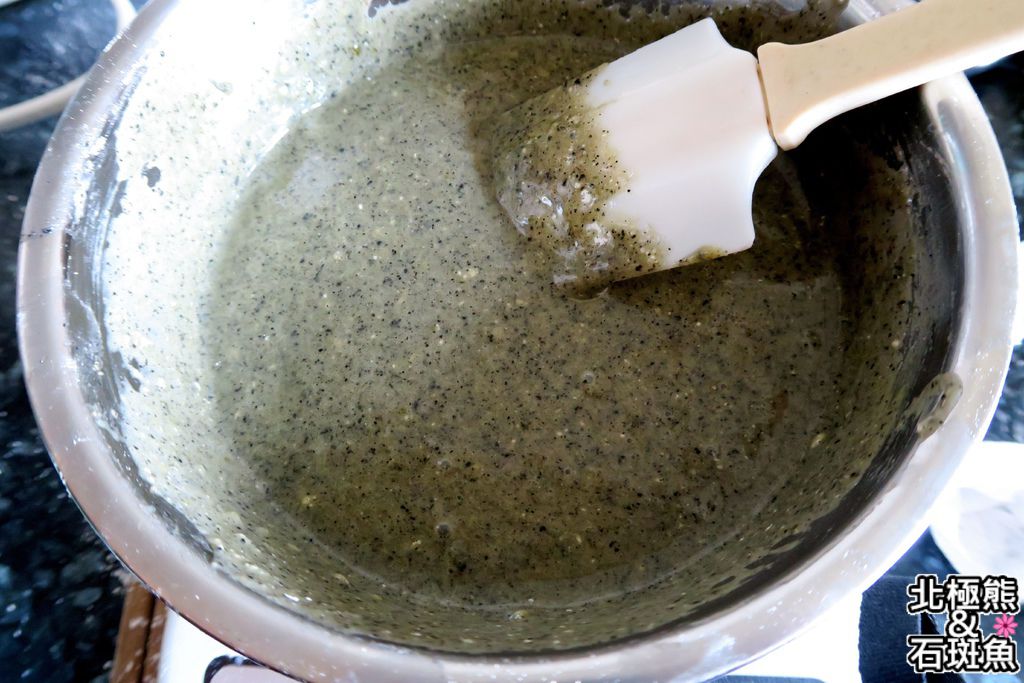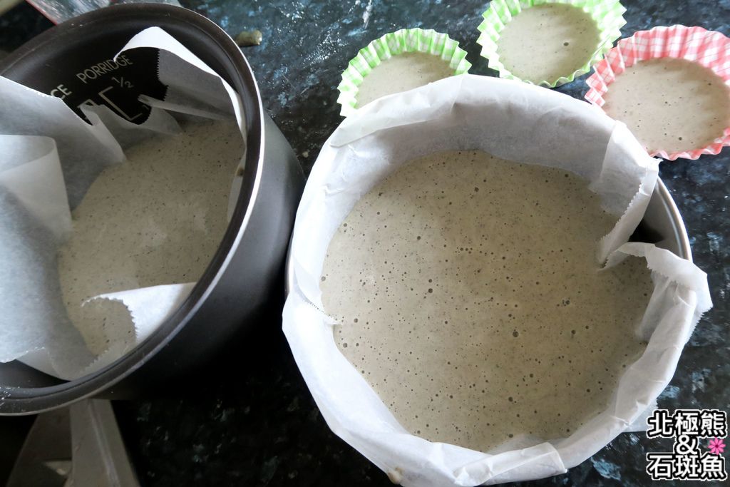 拌勻後倒入鋪好烘焙紙的蛋糕模中