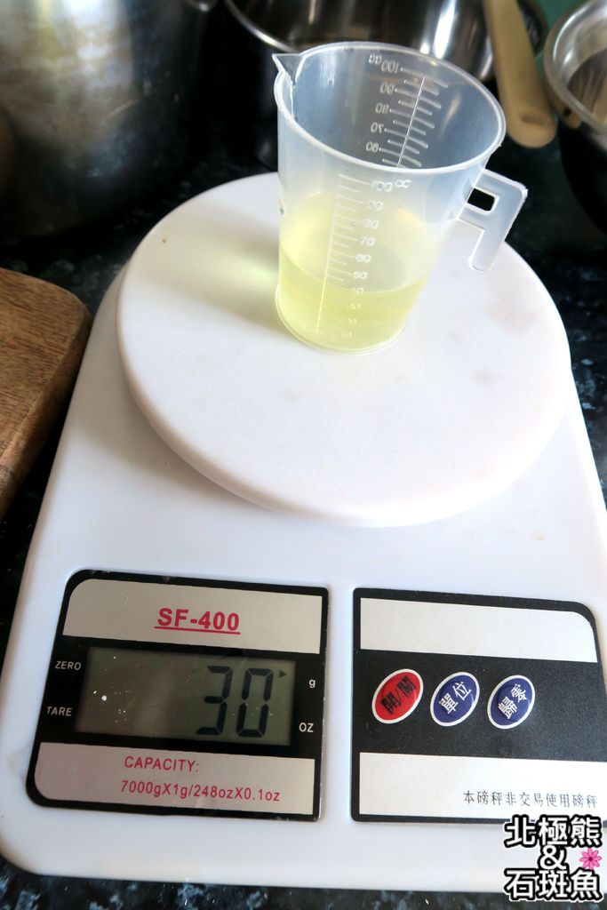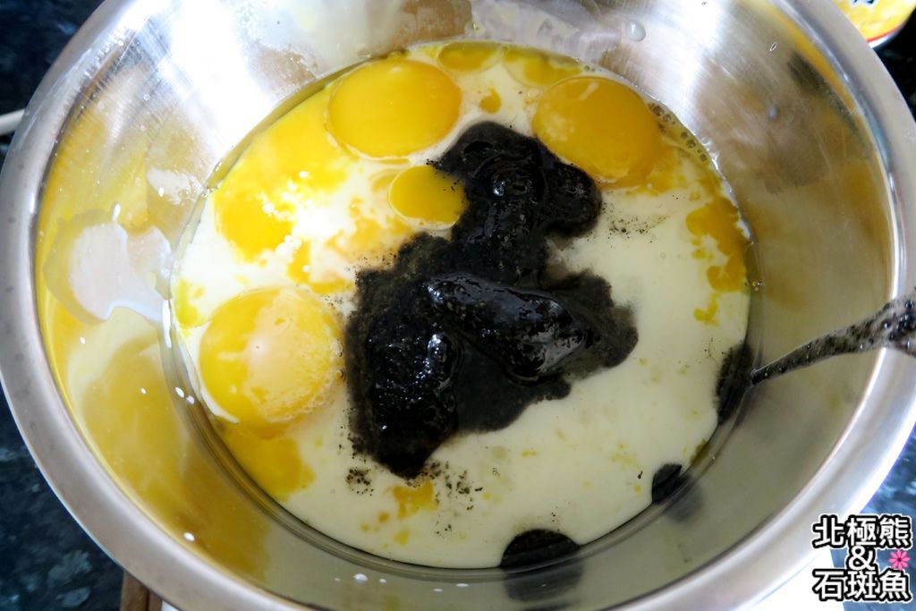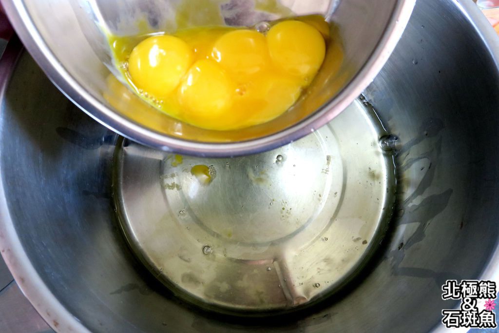 然後將30公克沙拉油、20公克砂糖、30公克芝麻醬、45公克牛奶加進蛋黃裡混合