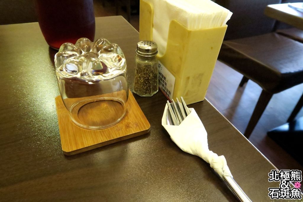 乾淨的水杯、面紙、叉子湯匙、黑胡椒
