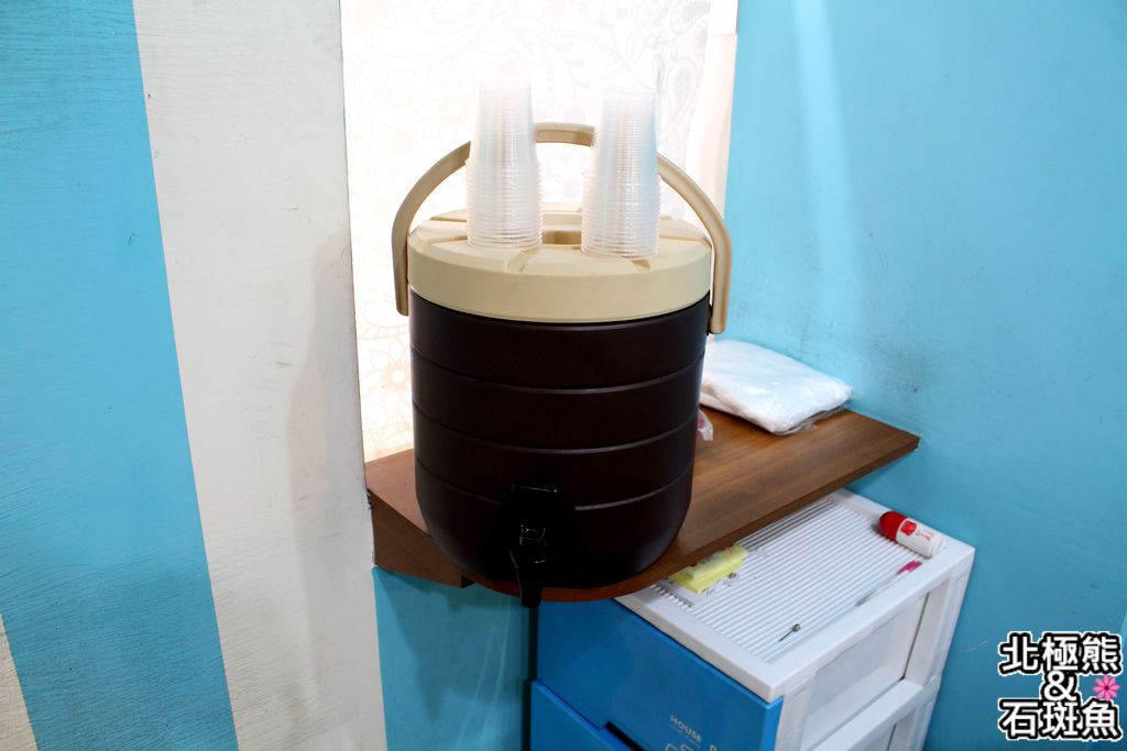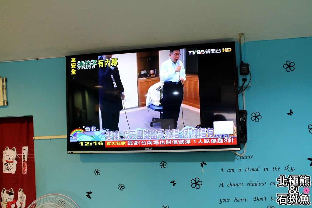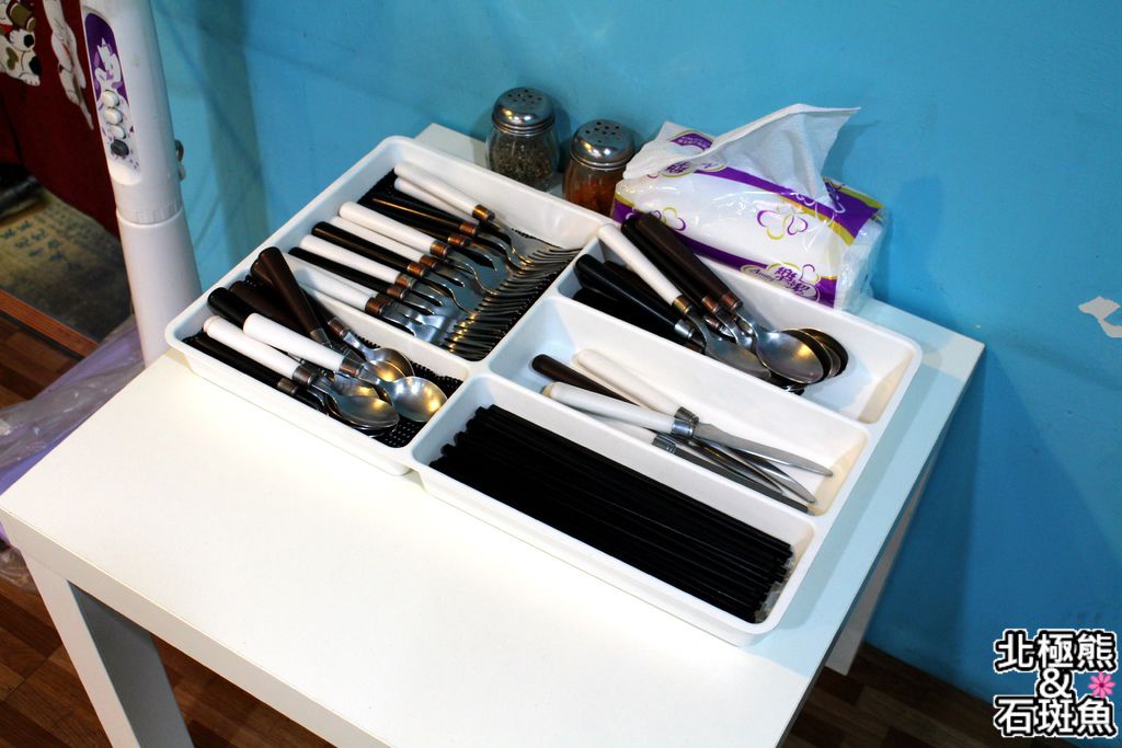 店裏頭的餐具調味料都放在電視下方讓客人自取