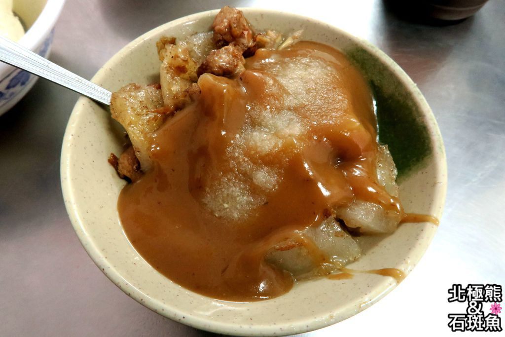 剪開的肉圓淋上特製醬料和一大匙蒜蓉