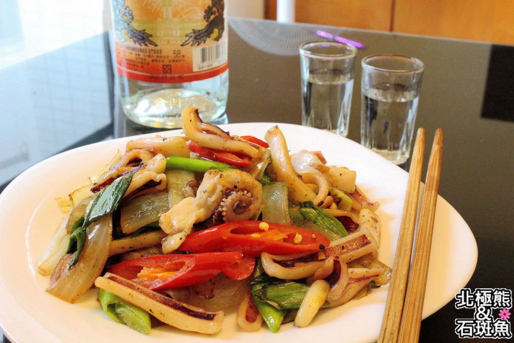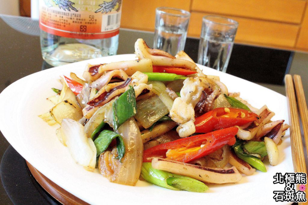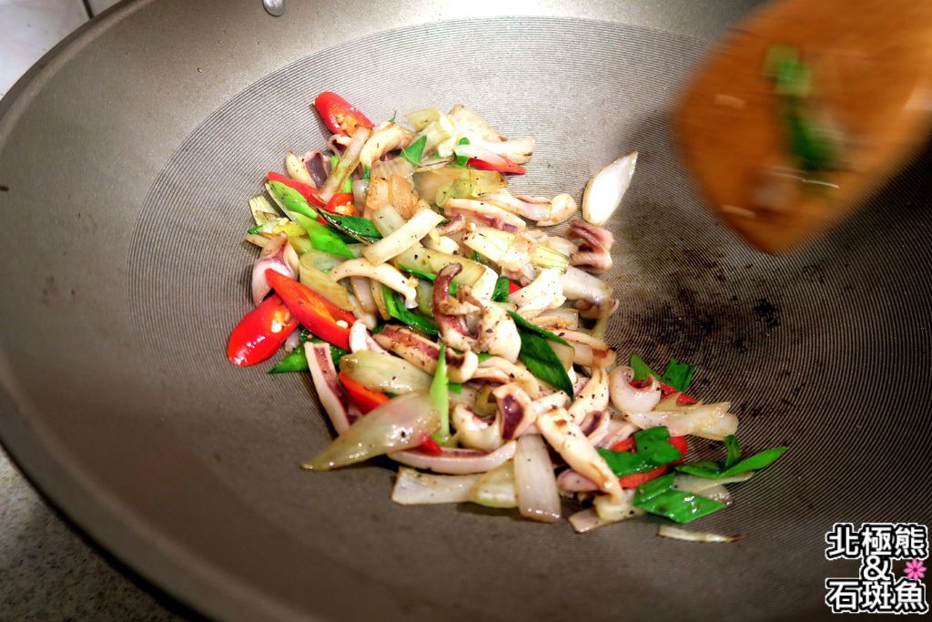 5.加入一夜干炒香20秒,快速加入切段的辣椒和蒜仔再翻炒10秒