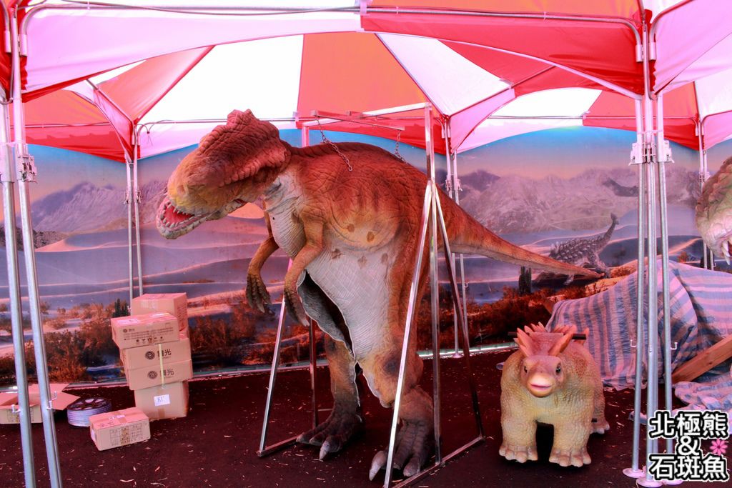 旁邊有棚子的區域堆置一些恐龍裝和恐龍車