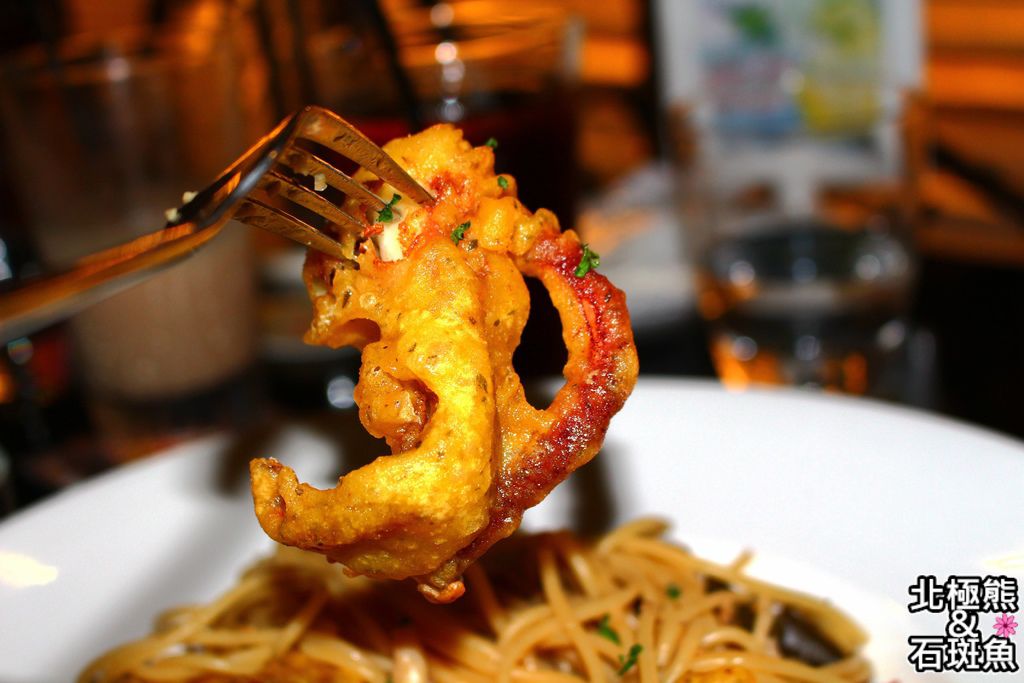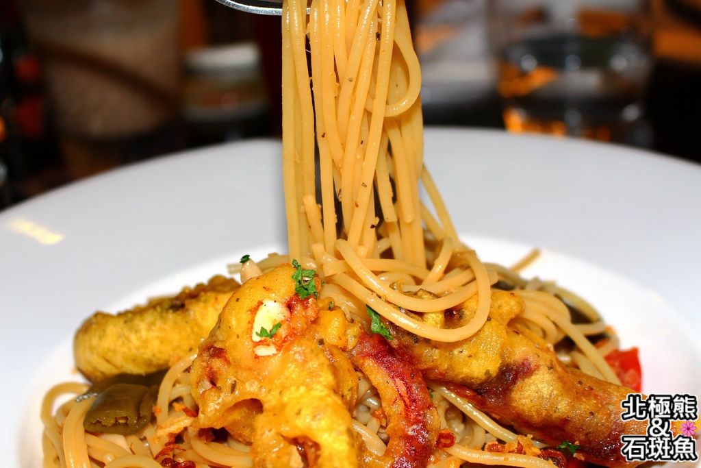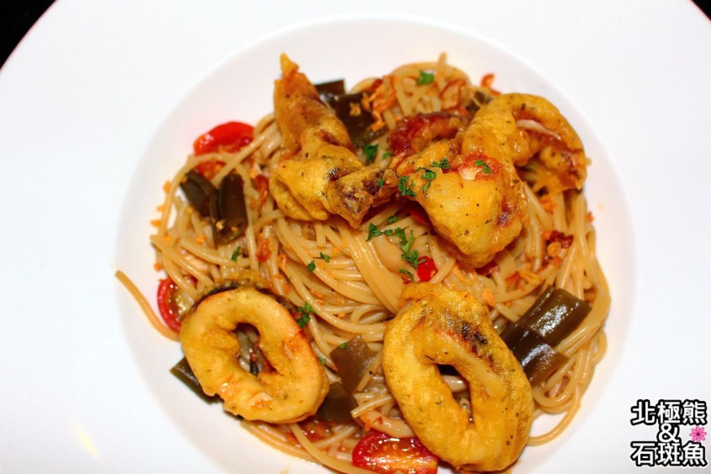 清炒的辣味義大利麵配大大塊的炸魷魚,是不是很過分?