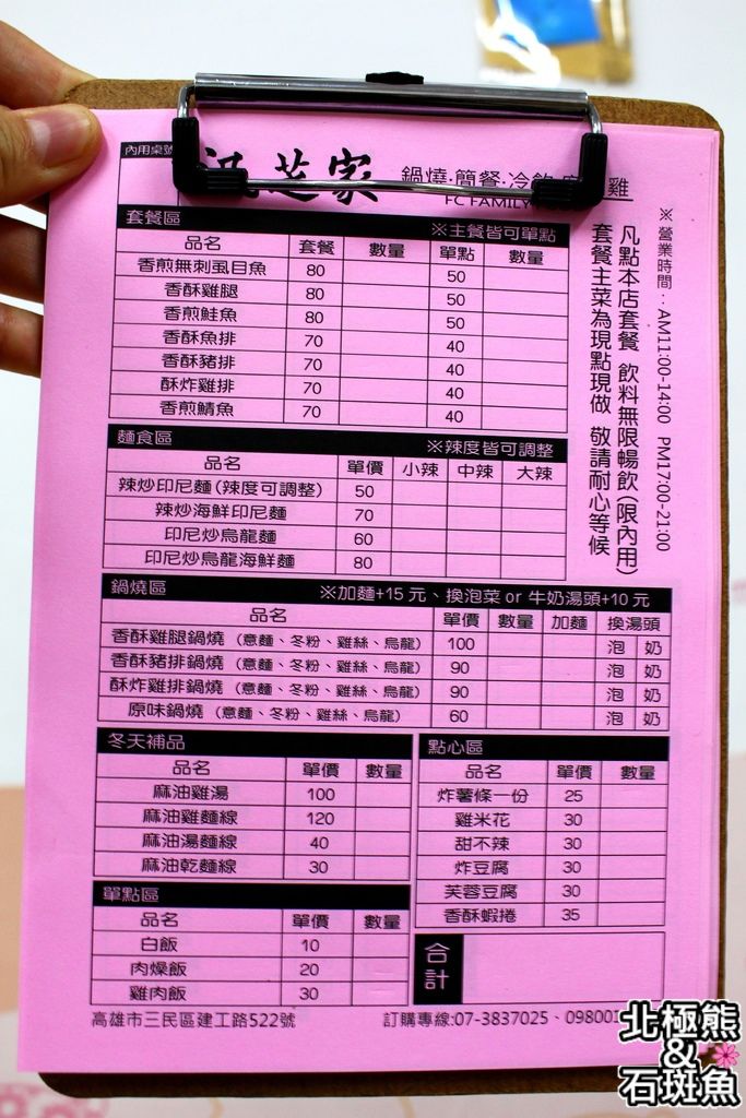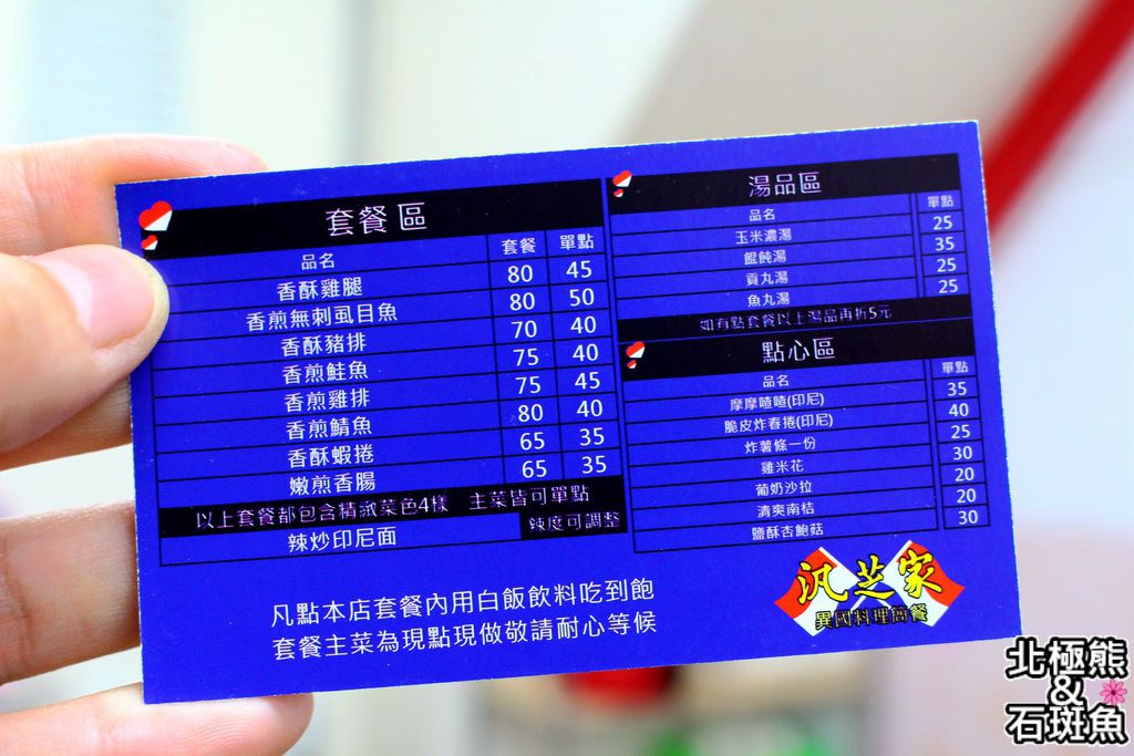 汎芝家異國料理簡餐餐點的價目表