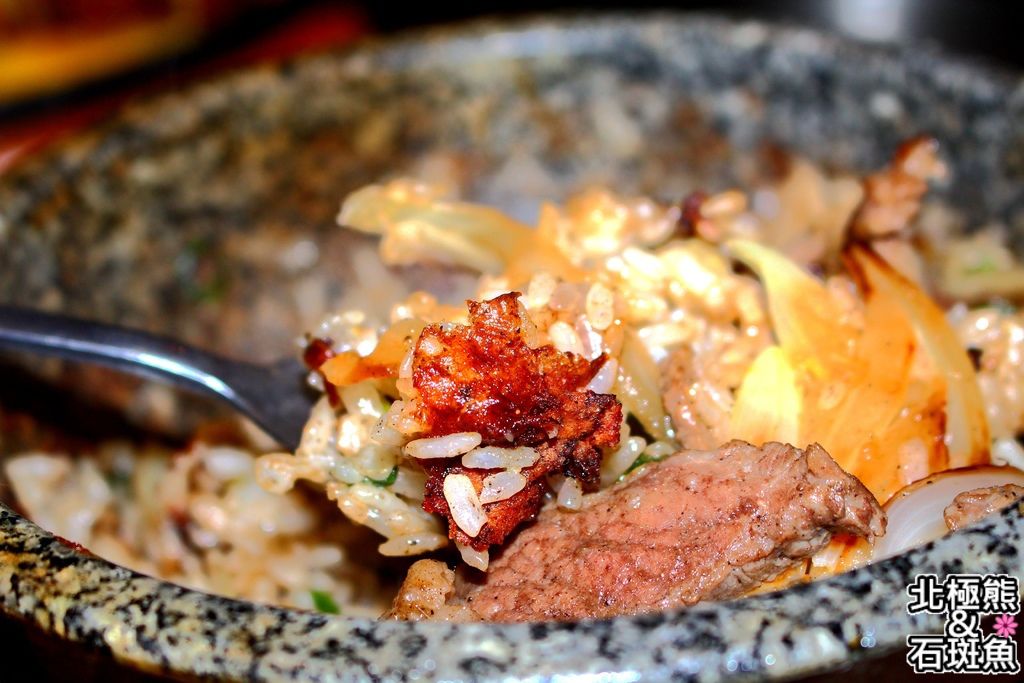 燒燙燙的石缽放著生牛肉端上桌,靠著碗的熱度將牛肉和洋蔥等調料拌開