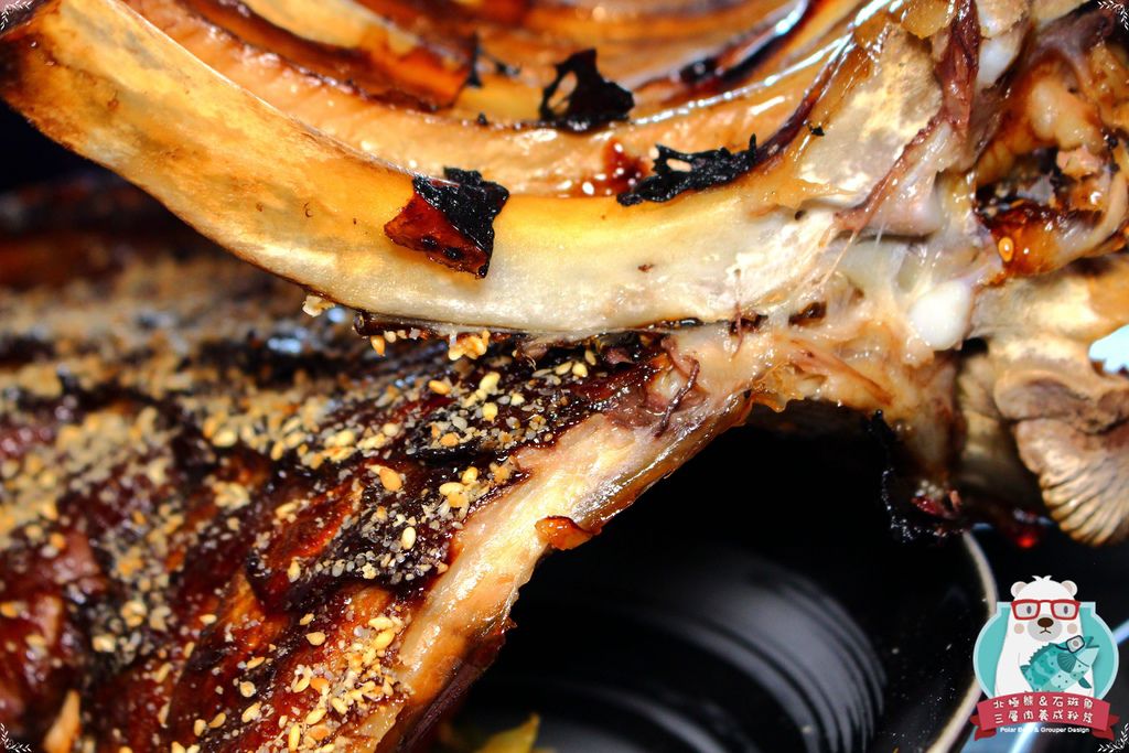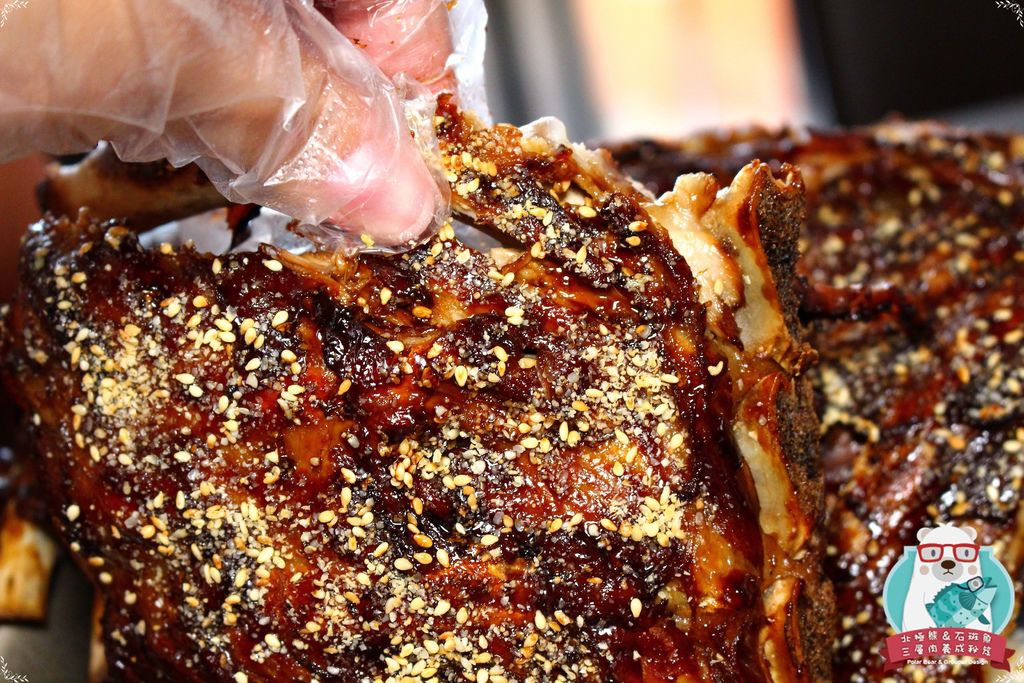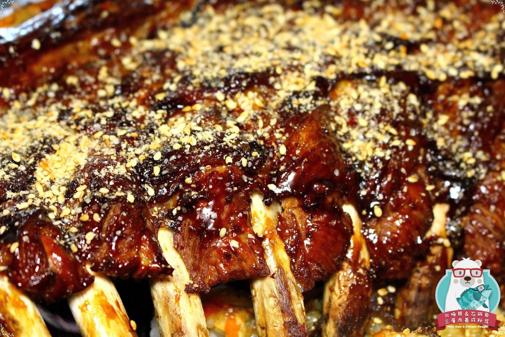 肋排經過醃漬入味後,以中文火及大火分別烤熟上色